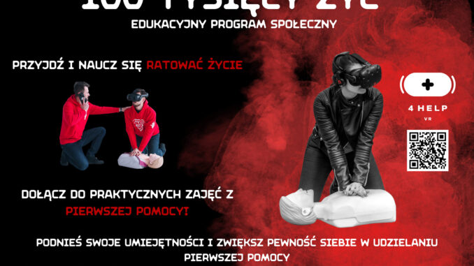 Dzięki współpracy z Fundacją 4 HELP, w ramach projektu „100 Tysięcy Żyć”, w dniach 15-21 listopada organizujemy innowacyjne szkolenia z wykorzystaniem nowoczesnych Gogli VR, które przeniosą uczestników do wirtualnej rzeczywistości, dzięki czemu zajęcia staną się bardziej realistyczne i angażujące.