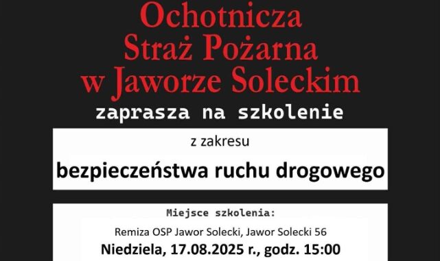 Ochotnicza Straż Pożarna w Jaworze Soleckim zaprasza rodziców z dziećmi na zajęcia z zakresu bezpieczeństwa ruchu drogowego, organizowane w ramach projektu „Razem dla wspólnego bezpieczeństwa – II edycja”. Praktyczne szkolenie, przypominające podstawowe zasady bezpiecznego i zgodnego z przepisami poruszania się po drogach (do dyspozycji uczestników m.in. miasteczko ruchu drogowego, podłoga interaktywna i alkogogle), odbędzie się w niedzielę, 17 sierpnia, o godzinie 15, w siedzibie OSP Jawor Solecki.