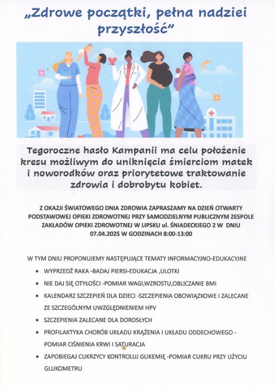 7 kwietnia przypada Światowy Dzień Zdrowia obchodzony w 2025 roku pod hasłem „ZDROWE POCZĄTKI, PEŁNA NADZIEI PRZYSZŁOŚĆ”. Zainaugurowana zostaje całoroczna kampania na rzecz zdrowia matek i noworodków oraz długoterminowemu zdrowiu i dobrostanu kobiet.