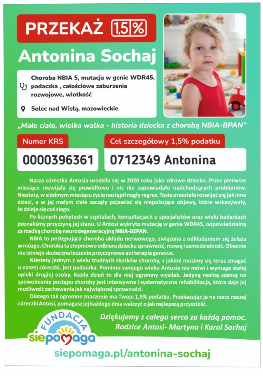 Martyna Sochaj, mama małej Tosi na profilu Tosia Sochaj walczy z NBIA informuje o możliwości przekazania 1 % podatku na leczenie córki: