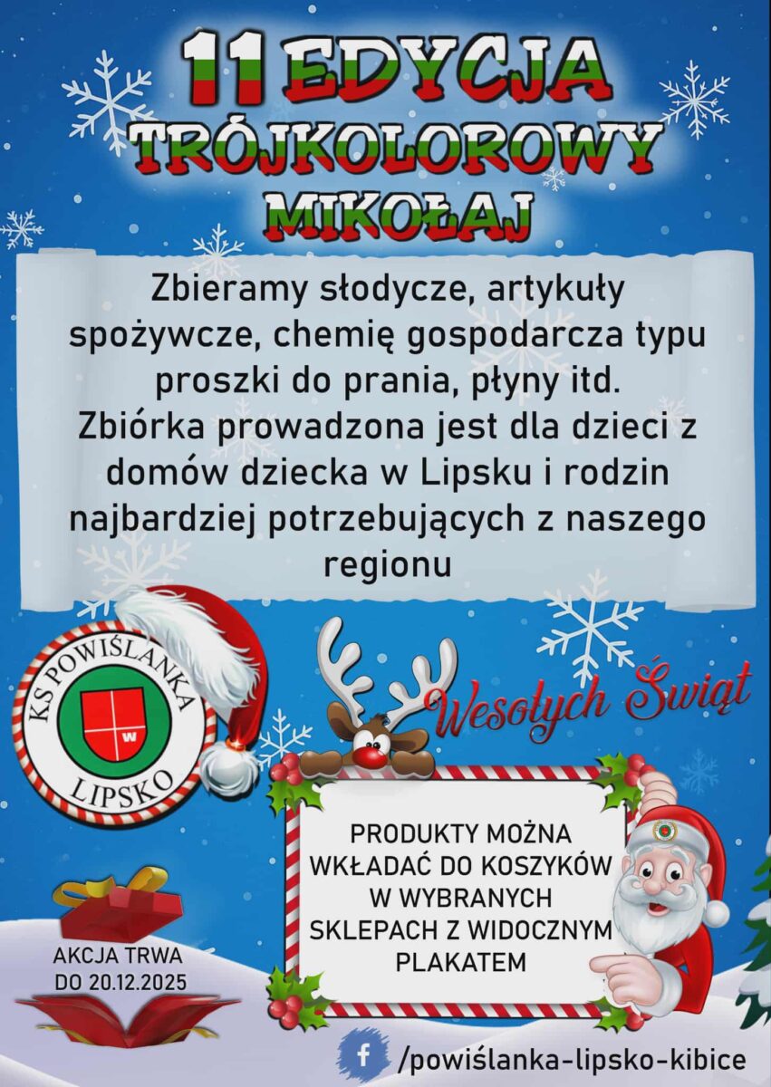 W Lipsku ruszyła jedenasta edycja akcji charytatywnej „Trójkolorowy Mikołaj”, organizowanej przez Powiślankę Lipsko (kibiców). To coroczne przedsięwzięcie, które łączy mieszkańców regionu wokół wspólnego celu – pomocy dzieciom i potrzebującym rodzinom z naszego powiatu.