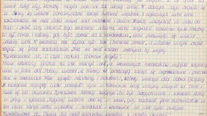 Mściwi hitlerowcy zjeżdżali do wsi, niszczyli, palili, a niewinnych mieszkańców zabijali [i] zagrzebywali w jednym dole. Polacy widzieli, że Niemcy źle postępują. Zaczęli się organizować i przeszkadzać [w niemieckich] napaściach. Wiele zginęło młodzieży i bohaterów, którzy walczyli dla dobra Ojczyzny. A szczególnie najwięcej ludzi poświęciło życie w Warszawie, kiedy wszyscy chwycili za broń i rzucili się na okupanta. Tymczasem Niemcy zwyciężyli, bo byli przygotowani, i zamienili stolicę w gruzy i zgliszcza. Najgorzej ludziom dali się we znaki, gdy nadszedł front nadwiślański. Wtenczas zaczęli ludzi wysiedlać i mordować, zostawiać po sobie tylko pustynię.