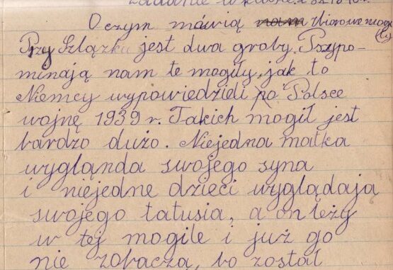 Przy Szlązku są dwa groby. Przypominają nam te mogiły, jak to Niemcy wypowiedzieli Polsce wojnę [w] 1939 r. Takich mogił jest bardzo dużo. Niejedna matka wygląda swojego syna i niejedne dzieci wyglądają swojego tatusia, a on leży w tej mogile i już go nie zobaczą, bo został zabity na wojnie.