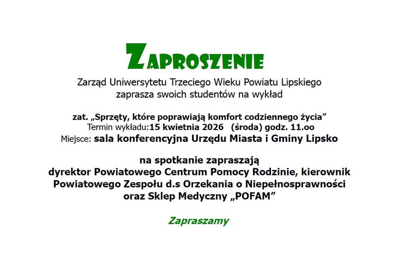 UTW zaprasza w środę na wykład 11 kwietnia 2026 rafales Wiadomości 0 Zarząd Uniwersytetu Trzeciego Wieku Powiatu Lipskiego zaprasza swoich studentów na wykład. Wspieraj MojeLipsko – pomóż nam się rozwijać