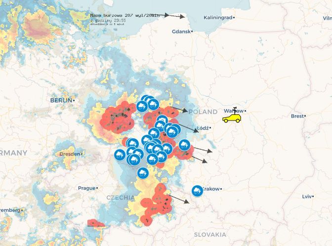 W stronę powiatu lipskiego zmierza silna i dobrze wykształcona burza superkomórkowa, mająca potencjał do wytworzenia trąby powietrznej, bardzo silnych porywów wiatru i opadów dużego gradu.
