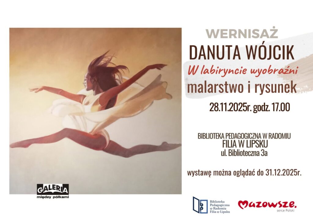 Wernisaż Danuty Wójcik w Bibliotece Pedagogicznej 22 listopada 2025 rafales Rozrywka 0 Czas czytania: < 1 minutęBiblioteka Pedagogiczna w Radomiu Filia w Lipsku zaprasza na wernisaż „W labiryncie wyobraźni” Danuty Wójcik. 28 listopada 2025 o godzinie 17:00. biblioteka pedagogiczna w lipskudanuta wójcikwernisażWspieraj MojeLipsko – pomóż nam się rozwijać