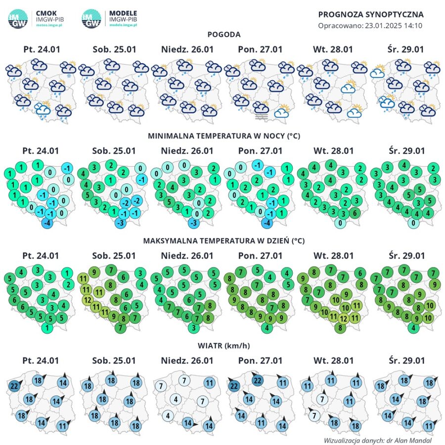 Polska pozostanie w zasięgu wyżu z centrum nad południowo-wschodnią Europą w przetransformowanej, polarnej morskiej masie powietrza. Zaznaczy się spadek ciśnienia atmosferycznego.
