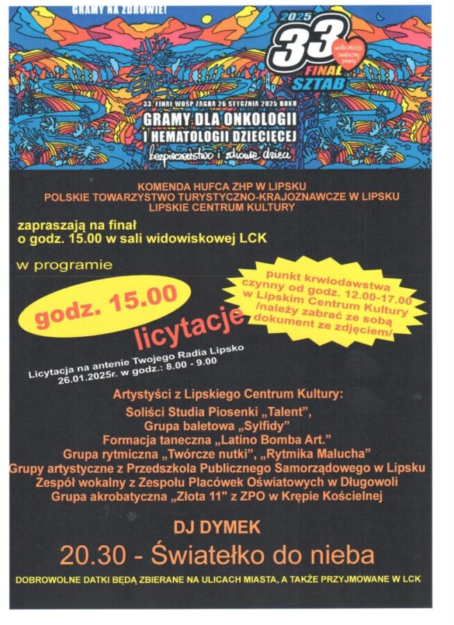 WOŚP w Lipsku. Bogaty program 23 stycznia 2025 rafales Rozrywka 0 Czas czytania: < 1 minutęLipski sztab Wielkiej Orkiestry Świątecznej Pomocy przygotował wiele atrakcji dla mieszkańców. Szczegóły na plakatach. wośpWspieraj MojeLipsko – pomóż nam się rozwijać