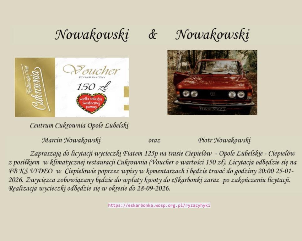 Panowie Marcin Nowakowski oraz Piotr Nowakowski zapraszają na ekskluzywną wycieczką. Licytacja odbędzie się podczas 34 Finału WOŚP w Ciepielowie.