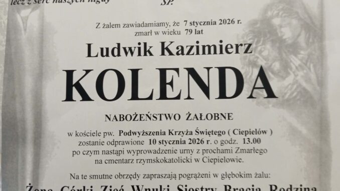 Zmarł Ludwik Kazimierz Kolenda – członek OSP Lipsko i Ciepielów 9 stycznia 2026 MZ Odeszli 0 Czas czytania: < 1 minutęNabożeństwo żałobne odbędzie się 10 stycznia 2026 roku o godzinie 13:00 w kościele w Ciepielowie. kolendaWspieraj MojeLipsko – pomóż nam się rozwijać