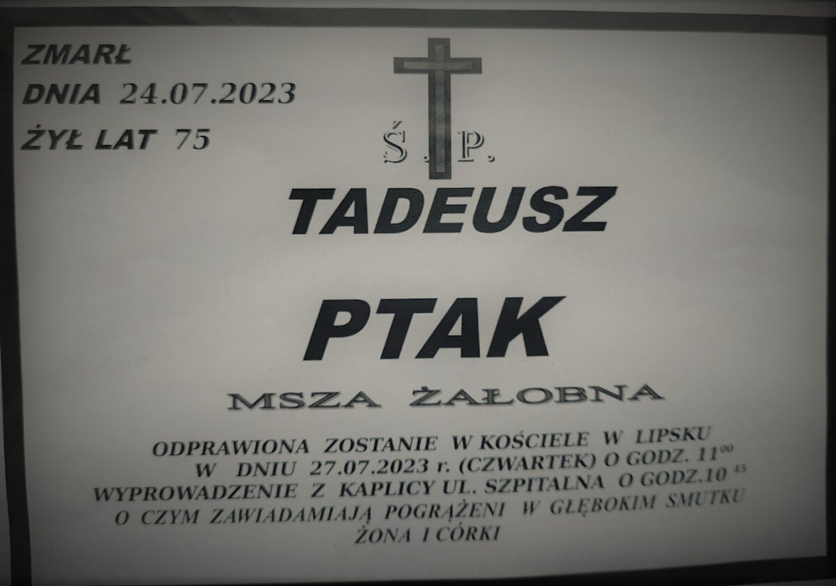 Zmarł Tadeusz Ptak 25 lipca 2023 rafales Odeszli 0 Nauczyciel, wieloletni Dyrektor szkoły ponadpodstawej w Lipsku oraz długoletni Kierownik Referatu Oświaty w Urzędzie Miasta i Gminy Lipsko. Msza żałobna o godzinie 11.00 w kościele w Lipsku w dniu 27 lipca. Tadeusz PtakWspieraj MojeLipsko – pomóż nam się rozwijać
