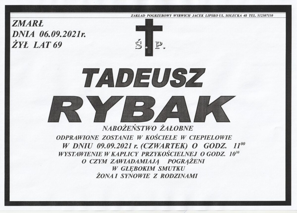 Z głębokim żalem zawiadamiamy, że w dniu 06.09.2021 r. zmarł st. ogn. w st. spoczynku Tadeusz Rybak.