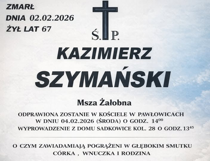 Zmarł Tata Pani Burmistrz Szymańskiej 3 lutego 2026 MZ Odeszli 1 Czas czytania: < 1 minutęKazimierz Szymański (Tata Pani Burmistrz Szymańskiej) zmarł 2 lutego 2026 r. w wieku 67 lat. kazimierz szymańskiWspieraj MojeLipsko – pomóż nam się rozwijać