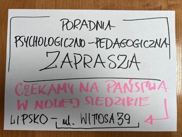 Powiat Lipski jako organ prowadzący Poradni Psychologiczno-Pedagogicznej w Lipsku uprzejmie informuje, że Poradnia Psychologiczno-Pedagogiczna w Lipsku zostanie przeniesiona z ul. Zwoleńskiej 12 na ul. Witosa 39.